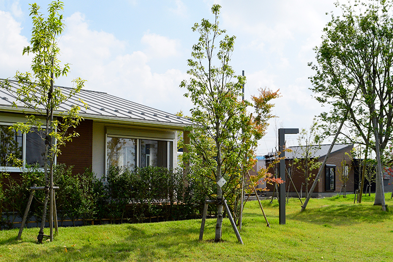 「町全体で借景を楽しめるロケーション」を条件に宅地を開発。 地形を最大限に生かして限られた土地を有効活用することで、 コストを抑えつつ、ゆったりと暮らせる空間を可能にしました。 また、平屋を連棟することで、将来的な日当たりの不安も払拭。